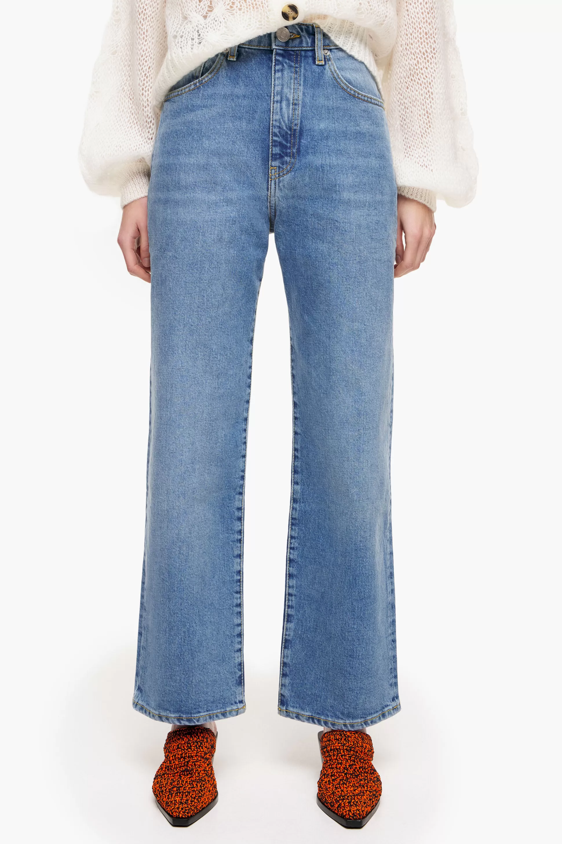 Jeans Em Cor Azul-Medio. Modelo De Corte Reto, Comprimento Cropped, Cintura Subida E Cinco Bolsos. Fecho-Eclair Frontal E Presilha Para Cinto.NN20% Fibras Recicladas.