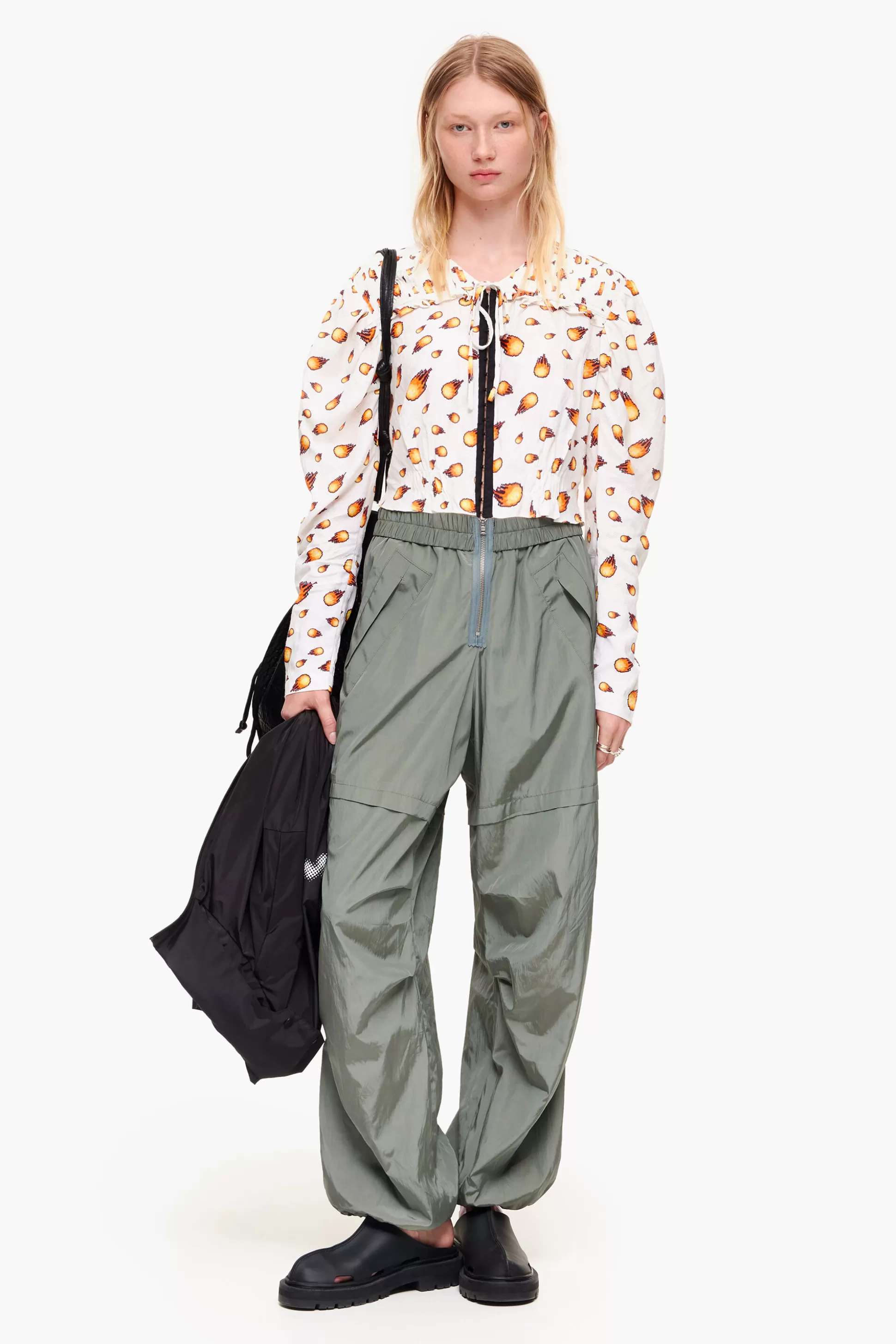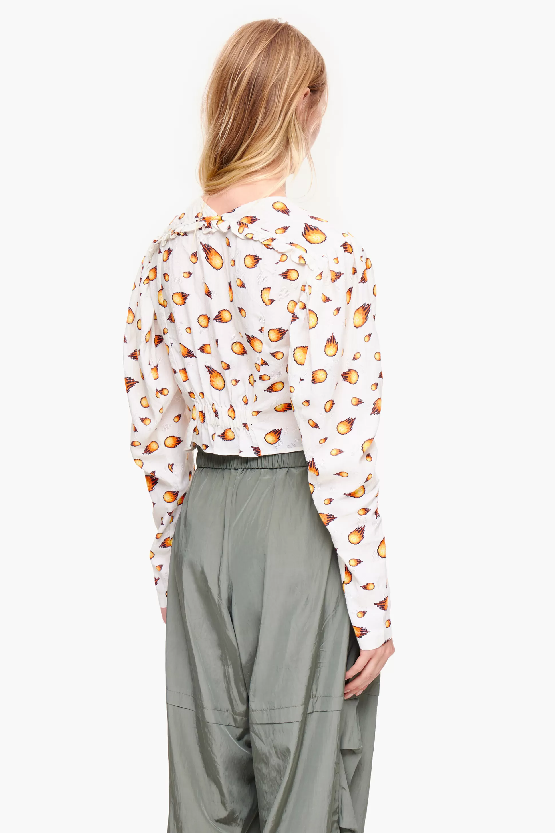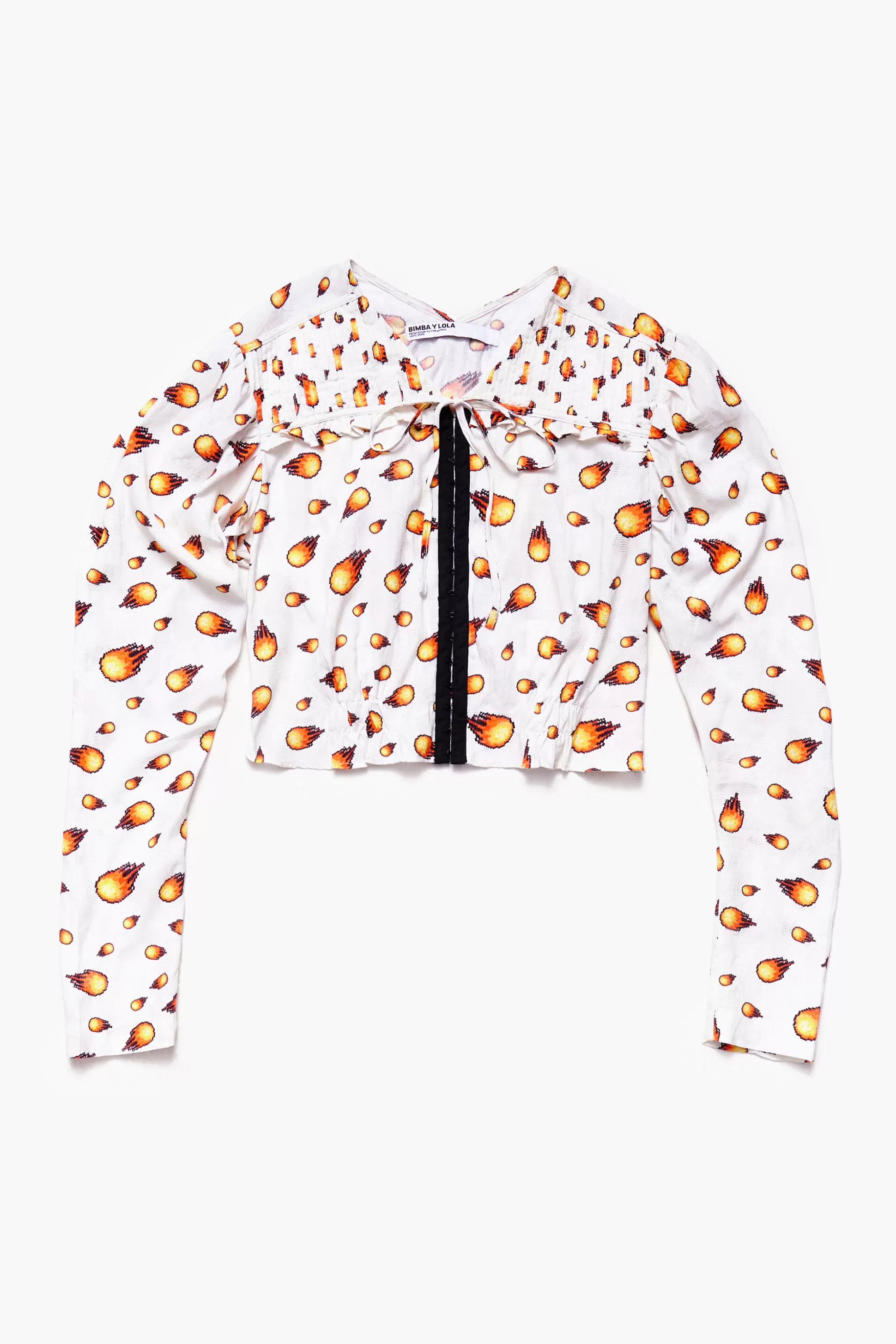 Blusa Curta De Viscose Com Print Fire Em Cor Marfim. Modelo De Manga Comprida Abalonada Com Fecho Central De Colchetes.