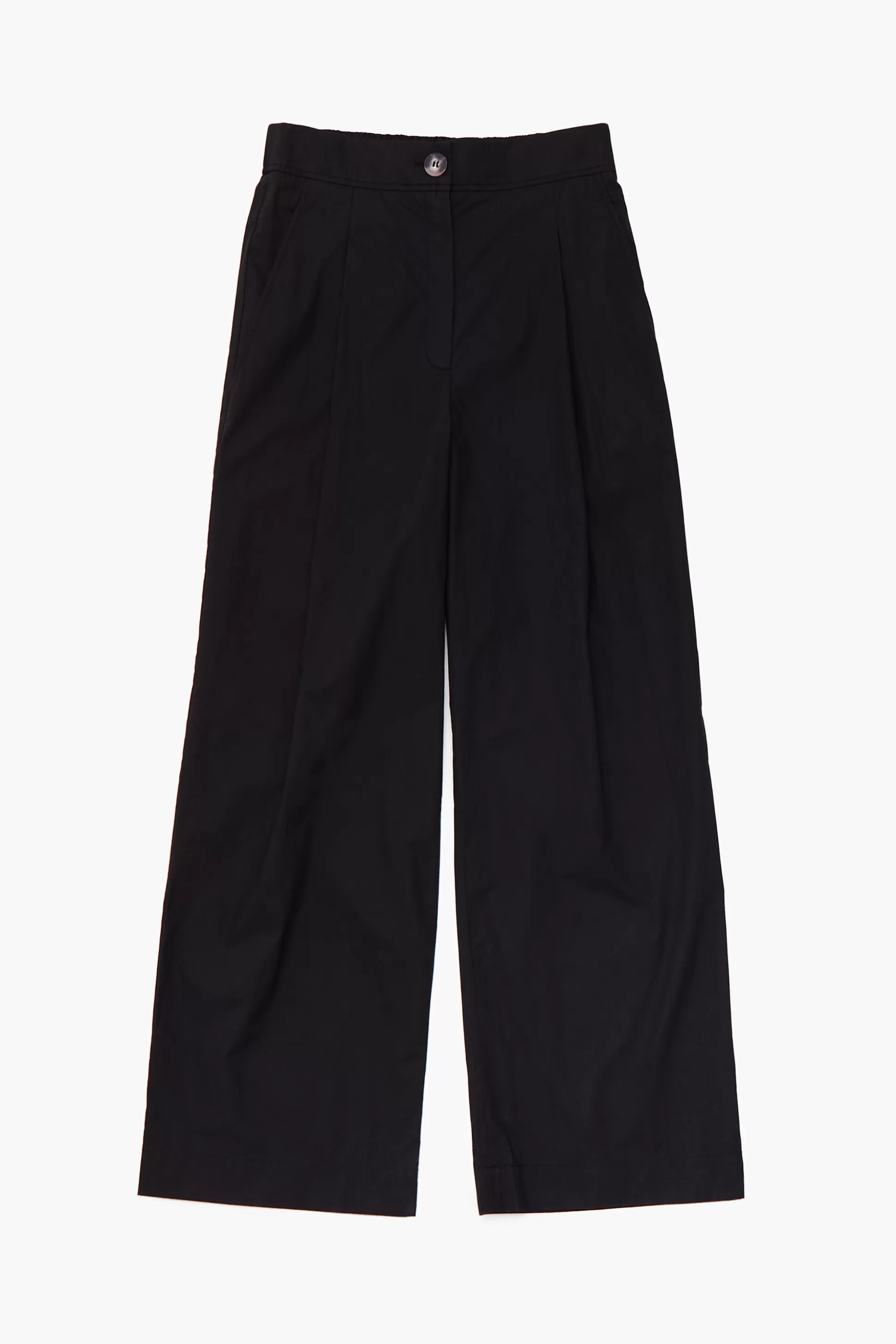 Calças Em Popelina De Algodao Em Cor Preta. Modelo De Corte Culotte, Comprimento Regular E Fecho-Eclair Frontal. Personalizado Com Pregas Frontais.