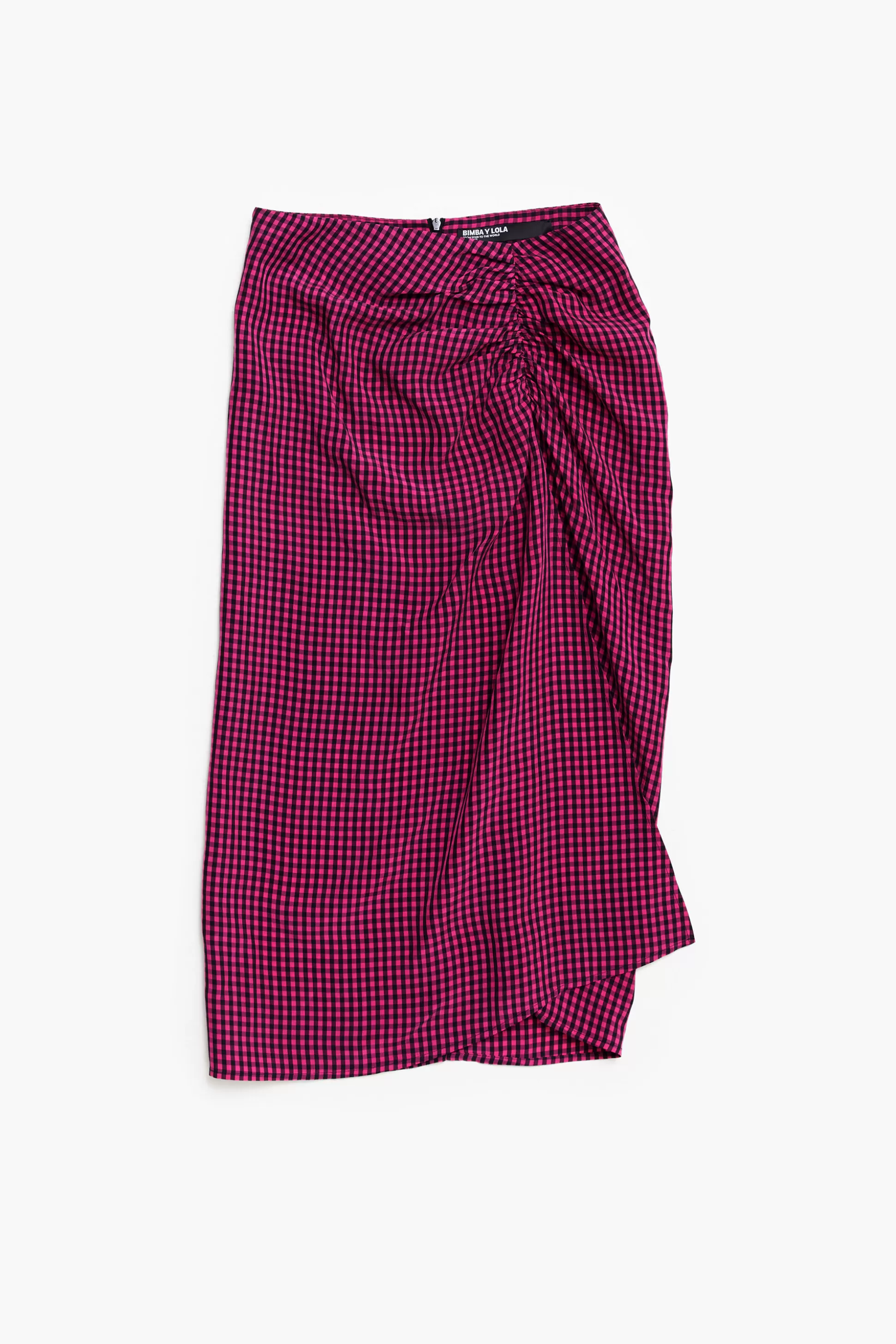 Saia Fluida De Cupro Com Quadrados Vichy Em Cor Fucsia . Modelo De Corte Reto E Comprimento Midi Com Franzido Na Frente.