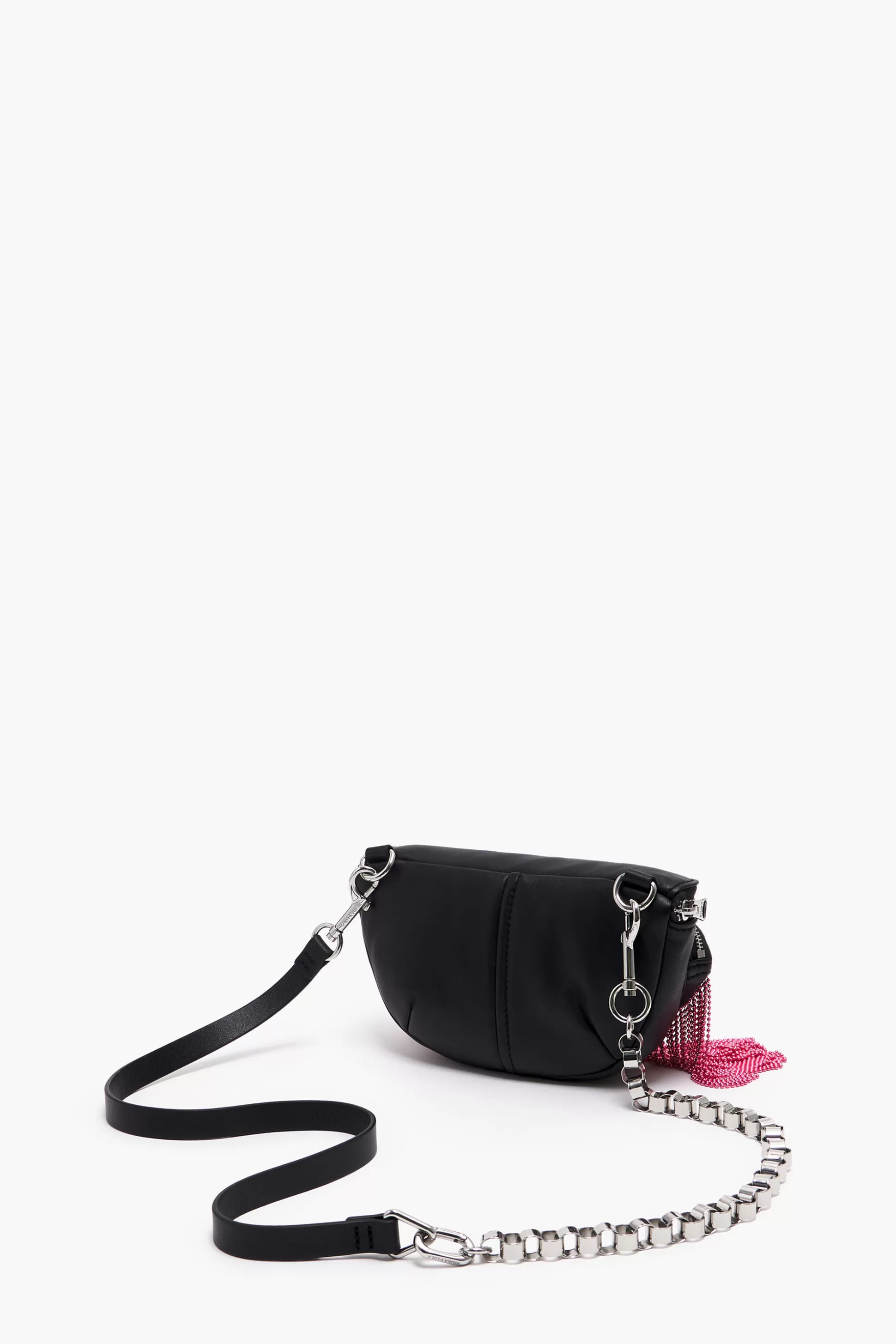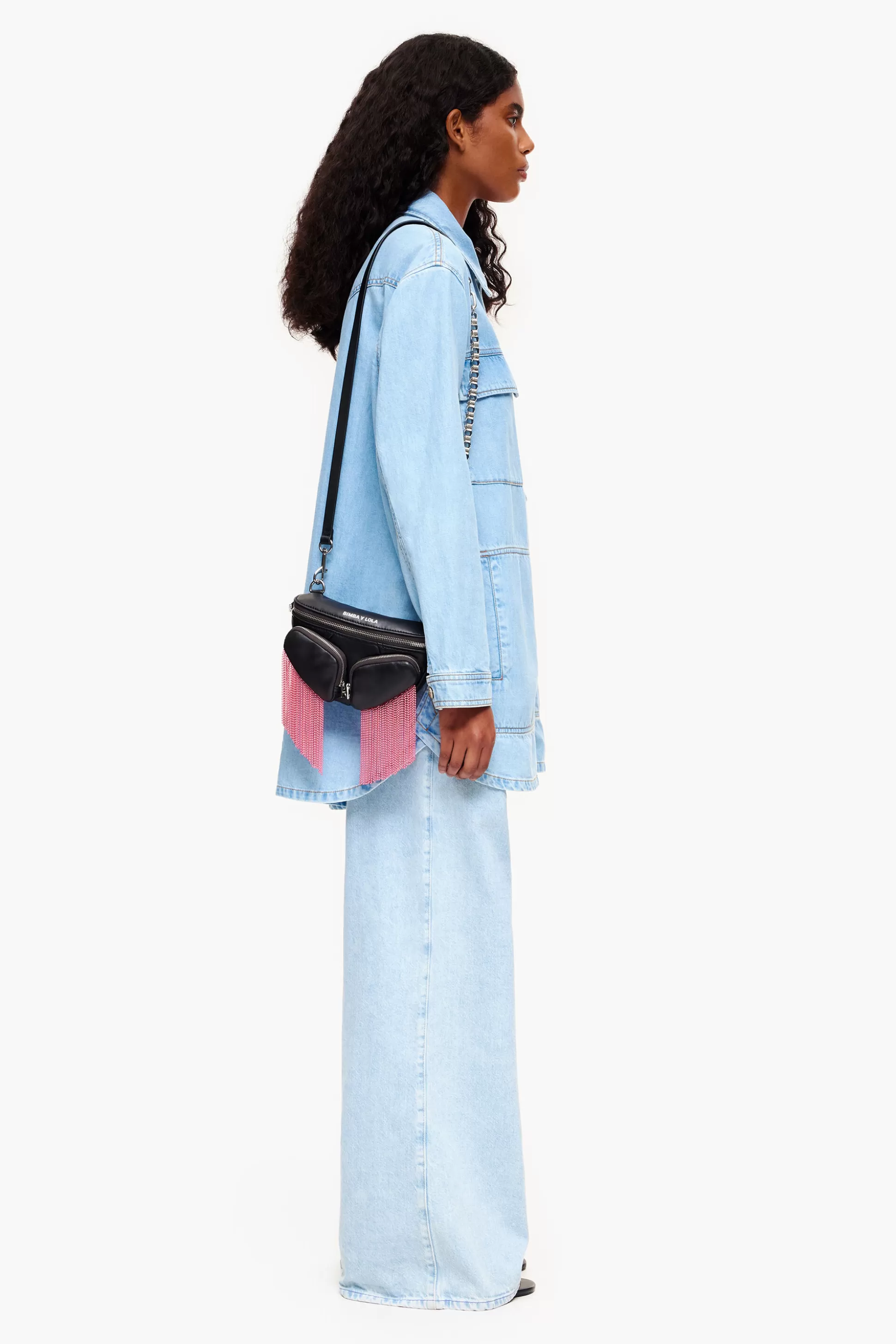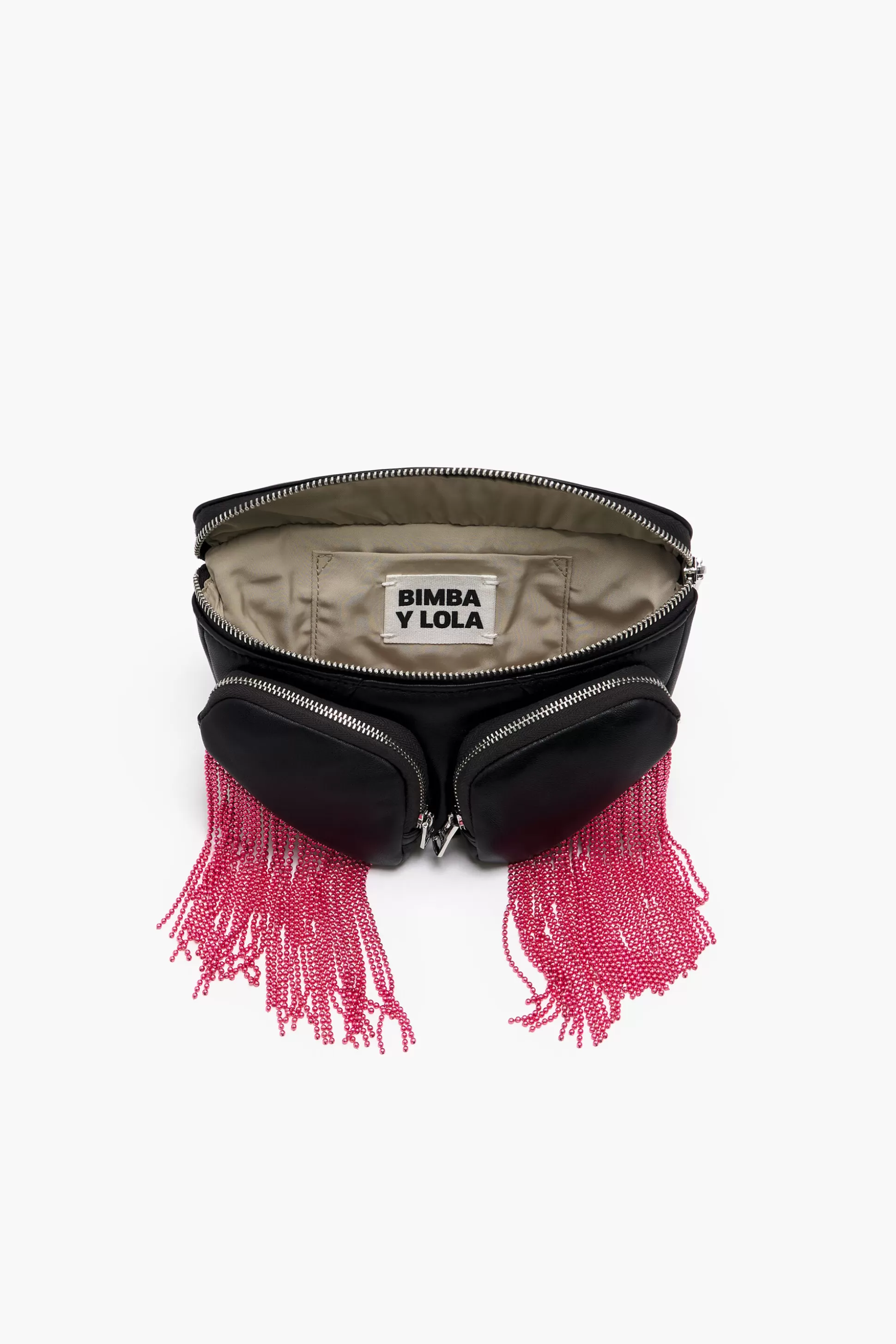 Bolsa De Cintura Pocket De Pele Em Cor Preta. Modelo De Tamanho Mini Com Franjas Em Contraste, Fecho-Eclair E Alca De Pe…